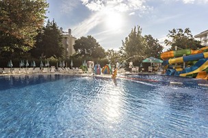 ****Tento oblíbený hotel se nachází v centru živého a oblíbeného letoviska Zlaté Písky a je vhodnou volbou zejména pro rodiny s dětmi. Součástí areálu je menší aqupark s několika skluzavkami a tobogány, pro děti i dospělé všech věkových kategorií je připravena bohatá nabídka sportovních a animačncíh programů. V okolí hotelu lze navštívit tradiční restaurace, obchůdky s lokálními suvenýry a další zábavní podniky. Dalším benefitem tohoto hotelu je bohatá nabídka doprovodných služeb. Hotel leží v sousedství sesterského hotelu Prestige Deluxe Aquapark Club, se kterým sdílí některé služby a vybavení.