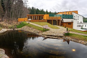 Hotelová jídelna a restaurace nabízí výbornou domácí i zahraniční kuchyně. Polopenze je podávána formou bohatého bufetu. Hosté mají možnost dokoupení servírovaných obědů. Sport a relaxaceMilovníci aktivního odpočinku jistě ocení venkovní a vnitřní sportovní zázemí - tenisový a badmintonový kurt, herna se stolním tenisem, bowling, profesionálně vybavené fitness centrum, tělocvična s možností zapůjčení sportovních potřeb, zapůjčení horských kol, lanové centrum s dětským hřištěm, workoutové hřiště, biliár a wellness centrum (krytý bazén s venkovní terasou, whirlpool, finská sauna, parní sauna, infra sauna, přírodní ochlazovací jezírko, venkovní hydromasážní vany, odpočinková zóna). Hotel nabízí také širokou nabídku masáží za zvýhodněné ceny a poskytuje jedno z nejrozsáhlejších sportovních a wellness zázemí v Jeseníkách. ZvířataPobyt s pejskem (do 50 cm) je možný za poplatek 250 Kč za noc. ParkováníSvé vozidlo si můžete zaparkovat na hotelovém parkovišti zdarma.Zajímavosti a okolíV okolí hotelu najdete výborné podmínky pro turistiku, kolo, letní i zimní sporty. Nedaleké středisko Hvězda slouží jako výchozí bod mnoha turisticky značených cest. Například trasa na Praděd nebo do překrásné Karlovy Studánky. V zimním období je k dispozici 12 km propojených sjezdovek dostupných na jeden skipas. Vzdálenost sjedovek od hotelu 600 až 2000 m. Karlov pod PradědemKarlov pod Pradědem je vesnice, část obce Malá Morávka v okrese Bruntál. Nachází se asi 2,5 km na západ od Malé Morávky.