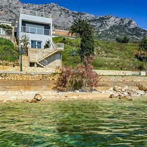 Oblázková pláž je přímo u apartmánu.Na fotografiích pláže je možné vidět dovezené oblázky.