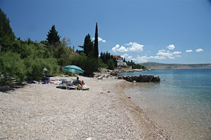 Na velmi pěknou menší a téměř soukromou pláž (jen pro pár domů) se dostanete po cca 50 m chůze z mírného kopce malebnou pěšinkou v zeleni. Pláž je tvořená hrubým pískem a oblázky.