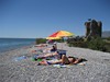 Několik kilometrů dlouhá hlavní pláž se zříceninou je vzdálená pouhých cca 100 m od studíí je rozmanitá (oblázky – hrubý písek – betonové plotny), místy rušnější, jinde liduprázdná. Vstup do vody je pozvolný.