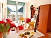 Trilo 6 Vista Lago Deluxe (trilo7): obývací místnost s kuchyňským koutem a rozkládacím gaučem, výhled na jezero, dva dvoulůžkové pokoje, koupelna.
