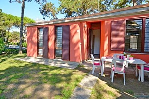 Type D-8 (quadri8): obývací pokoj s kuchyňským koutem a rozkládacím dvoulůžkem, dvoulůžková ložnice, pokoj s patrovou postelí, dvoulůžkový pokoj, soc. zařízení, oplocená zahrada.