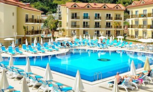 PolohaHotel se nachází ve vesnici Oludeniz, obklopené malebným pohořím Taurus. Je vzdálen asi 500 m od přísného centra s širokou nabídkou barů, restaurací a obchodů. Hotel je vzdálen cca 7 km od Hisaronu, známého svým rušným nočním životem, cca 12 km od historického města Fethiye a cca 60 km od letiště Dalaman.PlážPřibližně 850 m od hotelu se nachází široká písečno-oblázková veřejná pláž, jedna z nejkrásnějších v oblasti, končící impozantní lagunou. Lehátka a slunečníky na pláži k dispozici za poplatek cca 5 EUR/ks.K dispozici pro hostyČtyřhodinová recepce, lobby, restaurace s tureckou a mezinárodní kuchyní, vnitřní a venkovní prostory, snack bar, bar u bazénu. Bazén se skluzavkami a brouzdalištěm pro děti, lehátka a slunečníky u bazénu k dispozici zdarma. Hotel neposkytuje osušky. Za příplatek je k dispozici prádelna, lékař, půjčovna aut.InternetVe veřejných prostorách hotelu je k dispozici bezplatné Wi-Fi připojení k internetu, v pokojích je pokrytí slabé.StravaAll Inclusive: snídaně (07:30-10:00), pozdní snídaně (10:00-10:30), oběd (12:30-14:00) a večeře (19:00-21:00). Všechna jídla formou bohatého bufetu. Kromě toho občerstvení (14:30-17:00), zmrzlina (15:00-16:00), přestávka na kávu (17:00-17:30) a noční svačina (23:30-24:00) podávané ve snack baru. Místní nealkoholické a alkoholické nápoje podávané v baru v době obědů a večeří a v baru u bazénu (10:00-23:00). Za poplatek: importované nealkoholické a alkoholické nápoje a všechny nápoje podávané po 23:00. V restauraci jsou k dispozici vysoké židličky pro děti.Sportovní a animační programAnimace v lehké verzi: hry a aktivity u bazénu, aqua aerobik, vodní míč, aerobik. Třikrát týdně hotel pořádá večerní představení nebo tematické večery. Dále: fitness, kulečník, stolní tenis, šipky. Za příplatek: lázně, vodní sporty na pláži, potápění. Pro děti: dětské hřiště.